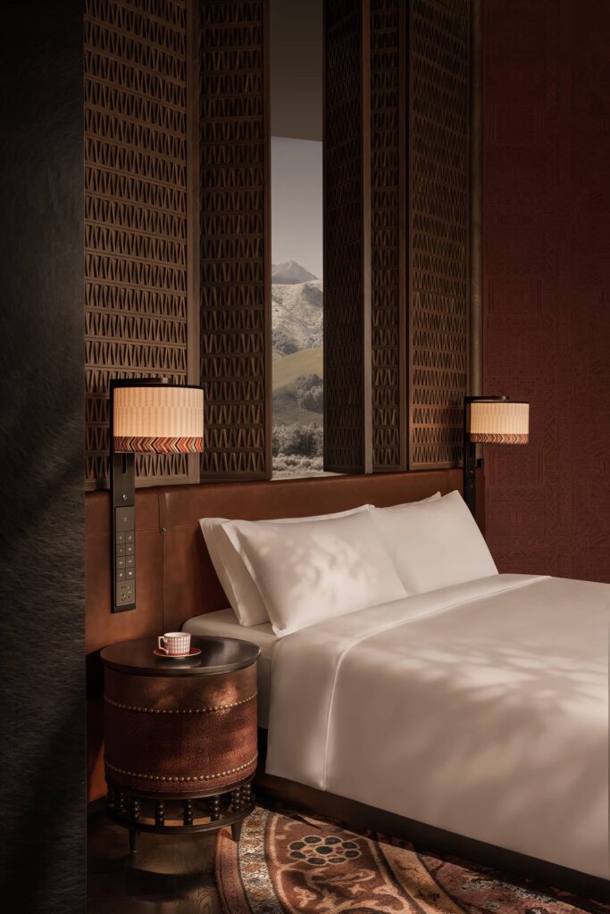 Aprendo le doppie porte in legno intagliate, l’ospite viene accolto in un ambiente raccolto, caratterizzato dai colori della terra; qui la luce passa attraverso un lucernario soprastante, ispirato al modo tradizionale di illuminare lo spazio delle iurte. Gli intagli e i motivi intrecciati e stratificati sulle pareti richiamano le decorazioni locali come anche i tappeti che attingono all’artigianato tessile: da arazzi a cuscini e coperte, i colori vivaci e i motivi unici riflettono la millenaria abilità artigiana, portatrice di un profondo sentimento culturale e di un’identità estetica. La tradizionale struttura in legno a reticolo della iurta è reinterpretata sulle pareti delle suite e sui divisori del bagno.