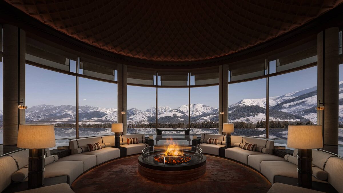 Il riferimento con il territorio e la vita nomade della steppa è sempre percepito in ogni ambiente, fin dalla reception che ricorda, con le sue sedute intorno a un camino centrale e la tettoia soprastante, scene di vita nella steppa come i raduni intorno al fuoco delle popolazioni nomadi. Ampie vetrate curve a tutta altezza chiudono la lounge mettendola in collegamento visivo con l’esterno; qui l’indoor si confonde con l’outdoor, garantendo la piena vista sulle montagne del Thiansan.